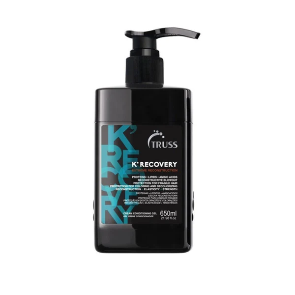 **PUMP NOT INCLUDED** Protection during Bleaching Process: Prepare mixture: Add 1 pump (Quarter size) of K Recovery TRUSS to bleaching powder mixture (Bleaching Powder + Hydrogen Peroxide TRUSS). Blow Dry Restore: Wash the hair with Shampoo and Conditioner TRUSS according to hair type. Apply 1 to 2 pumps of K Recovery TRUSS throughout entire length of the hair. Blow dry hair straight. Keratin Restore: Wash the hair with Clarifying Shampoo TRUSS (thick, resistant or virgin hair) or with Bidimensional Shampoo TRUSS (porous, damaged or chemically treated hair). Remove excess water. Apply K Recovery throughout entire length of the hair (approx. 1.5 oz. for medium length hair). Massage gently from ends to roots. Do not rinse. Flat-iron the hair with the Exclusive Steam Flat Iron TRUSS used with the Restore Complex TRUSS, piece by piece. Do not rinse. Apply Intensive Nutrition Work Station TRUSS. Massage gently for 5 minutes. Rinse. Apply a Thermal Protector TRUSS of your preference. Blow dry and style as desired. IT CAN BE USED ON ANY INSTANTANEOUS RECUPERATION TREATMENT WHERE THE FIBER IS IN NEED OF KERATIN + COLLAGEN.