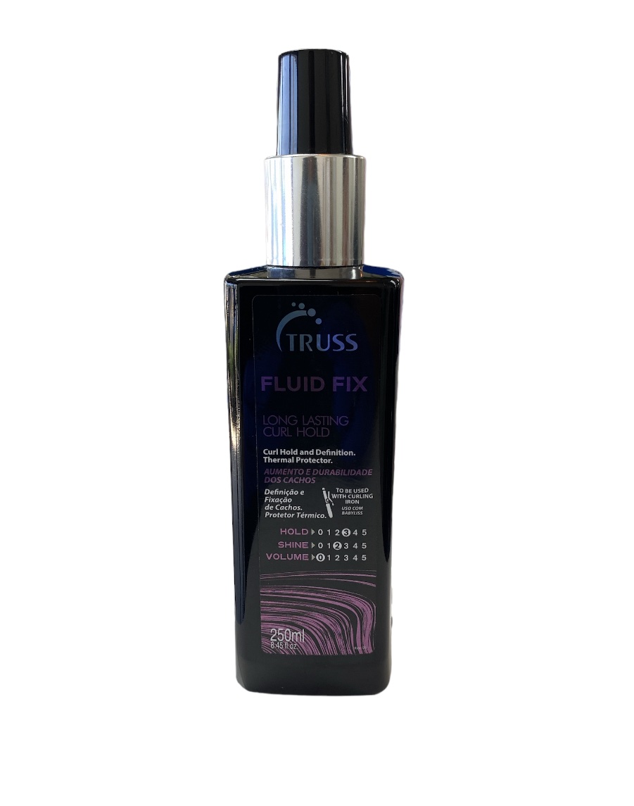 Truss Fluid Fix is a long-lasting curl and style hold defining leave-in spray. Provides volume at the roots, controls frizz, increases durability of hair styles for up to 24 hours and dries fast. Highly recommended to be used with curling iron. Elaborated with active ingredients that have bio affinity with the hair, Fluid Fix assists in the recovery of the hair’s natural structure.
